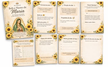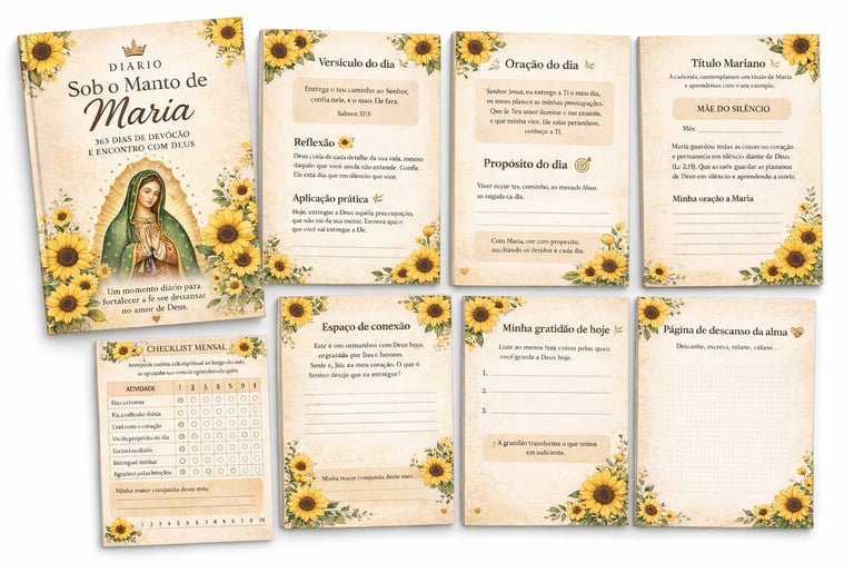 O Diário Sob o Manto de Maria se torna um refúgio diário — um momento só seu, onde você consegue parar, respirar e se reconectar com Deus de forma leve e guiada.